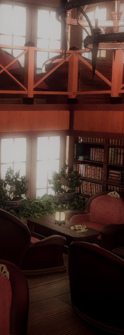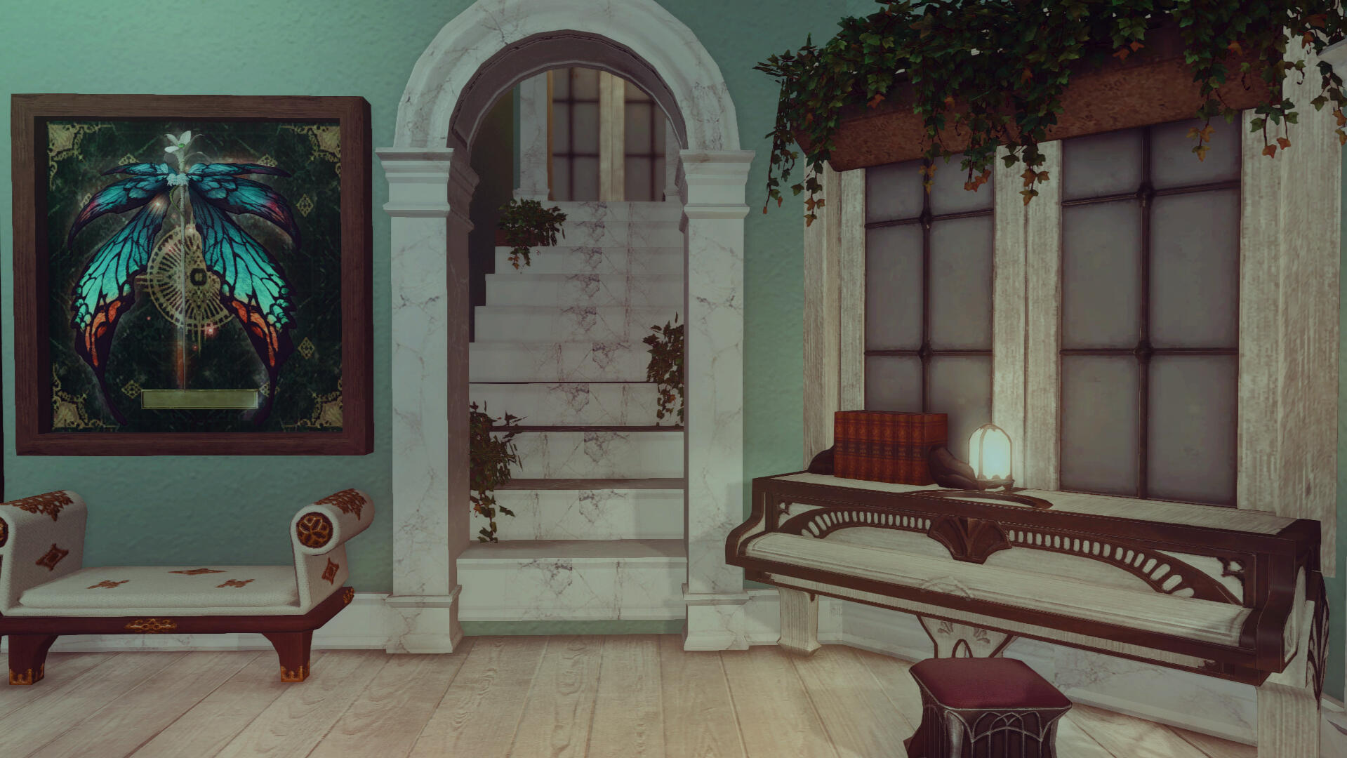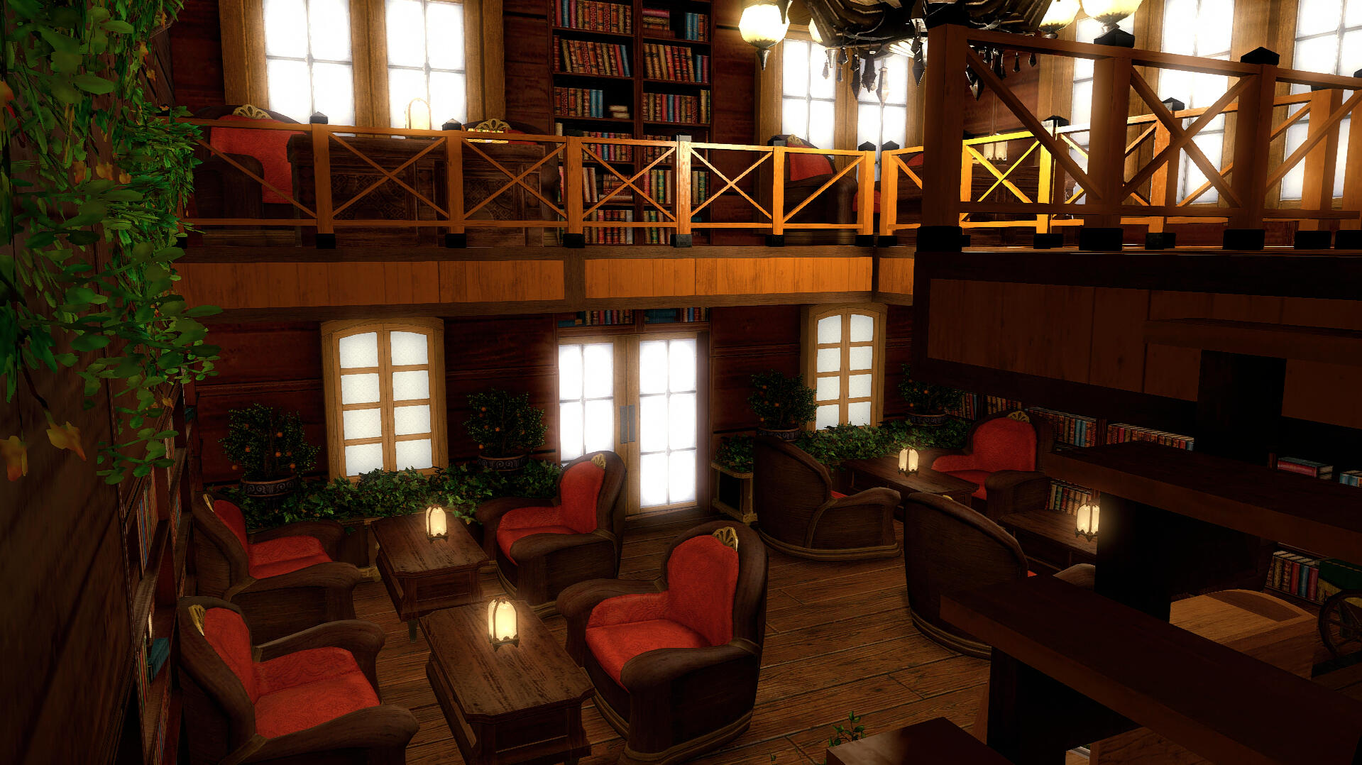 DESCRIPTION: This is a Medium house filled with foliage and marble on the first floor and a bit rustic style on the second floor. It has a Bedroom, Kitchen, Dining Area, Reading Nook.